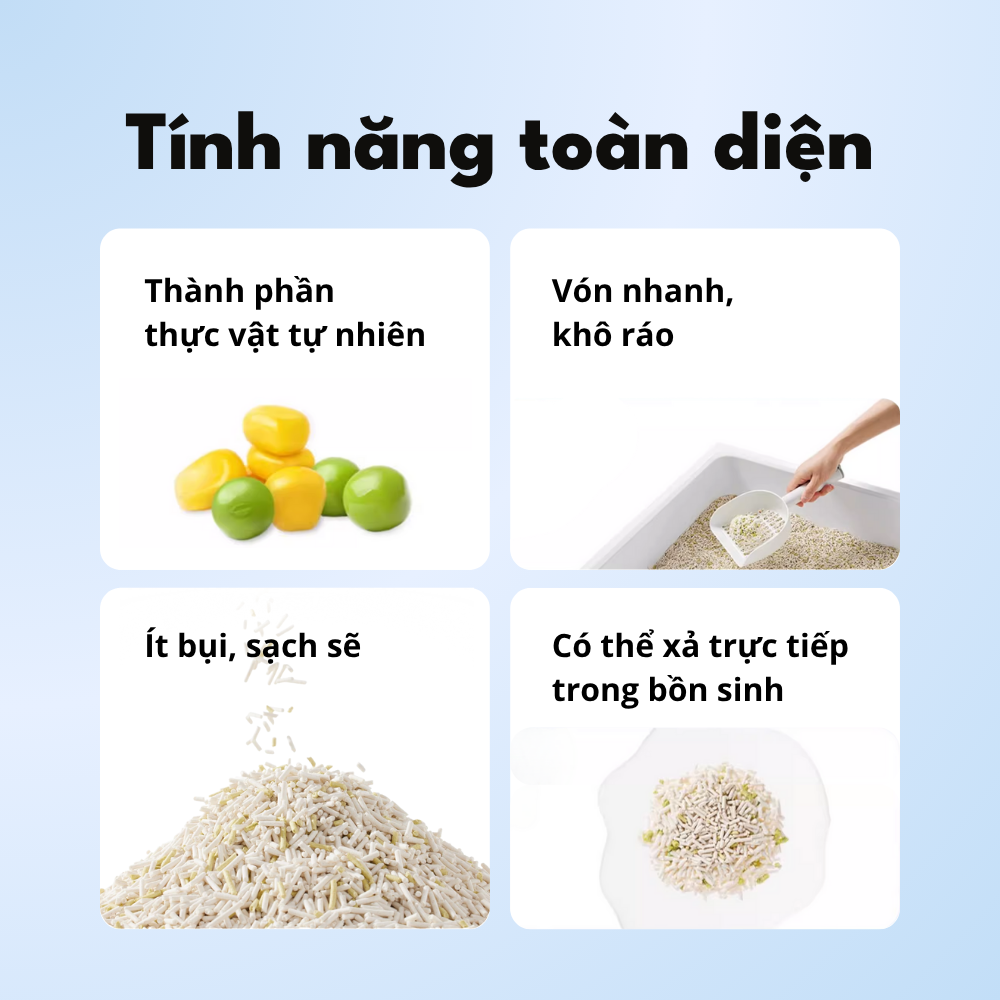 Công thức từ thực vật, không bụi, vón cục nhanh, dễ dọn. Có thể xả bồn cầu, thân thiện môi trường và an toàn tuyệt đối cho mèo. Đây là loại cát vệ sinh cho mèo vừa tiện lợi, an toàn cho thú cưng, vừa thân thiện với môi trường.