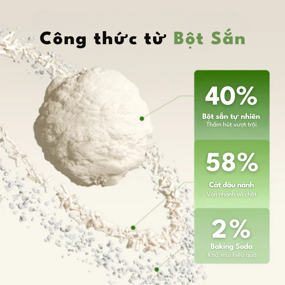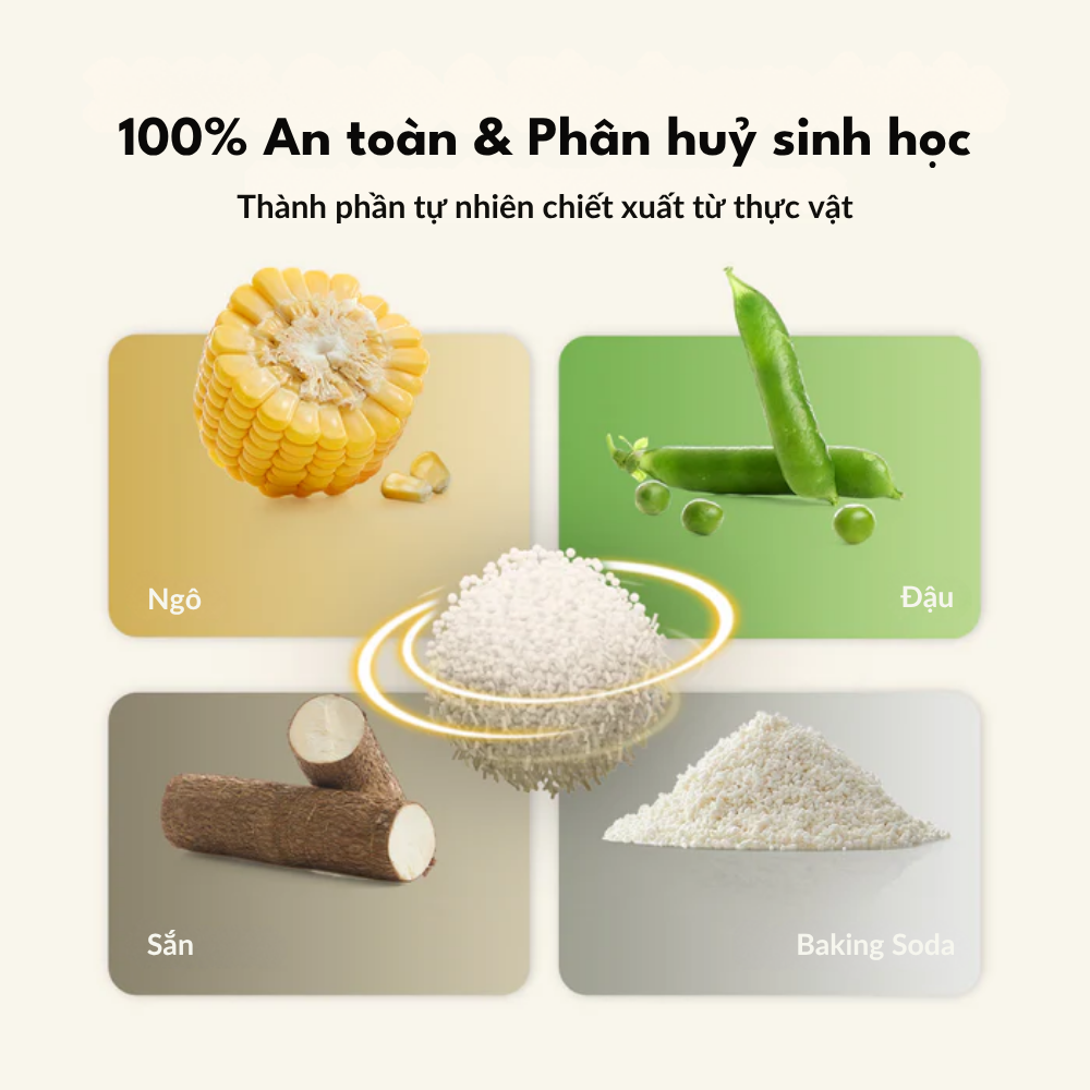 Thành phần tự nhiên 100%: Kết hợp từ đậu phụ, sắn (khoai mì) và baking soda, không chất tạo mùi – an toàn tuyệt đối cho mèo, kể cả mèo con hoặc mèo nhạy cảm.