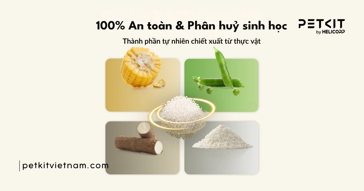 Loại cát này thường được làm từ đậu nành, bắp, sắn… – hoàn toàn tự nhiên, an toàn cho mèo và thân thiện với môi trường.