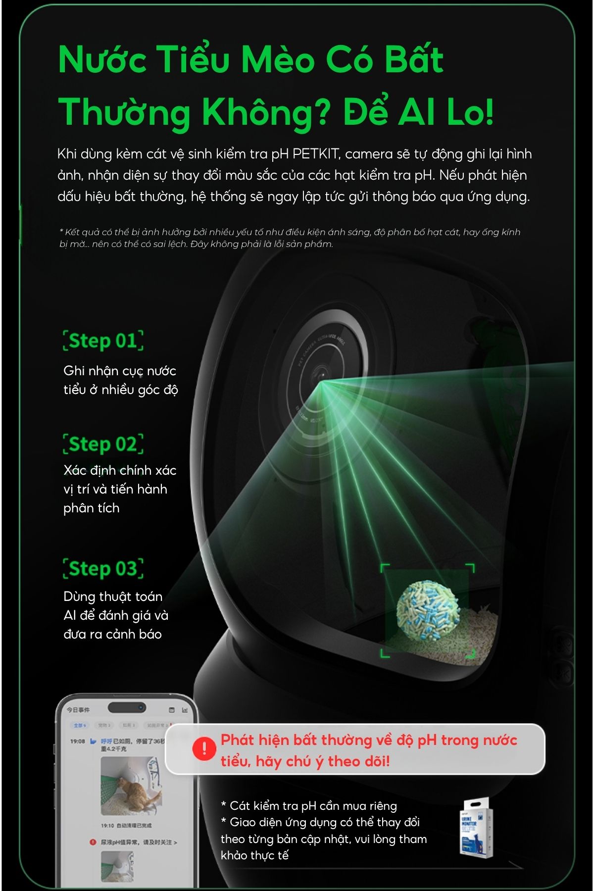 Đồng thời, camera AI này cũng có khả năng cũng ghi lại tình trạng phân, nước tiểu của mèo (khi kết hợp cùng cát phát hiện máu Petkit) để biết mèo đang có vấn đề gì về sức khoẻ hay không. Vì đặc tính của mèo thường dấu bệnh, ít thể hiện dấu hiệu ở giai đoạn sơ khai và khi mèo biểu hiện tình trạng bệnh thì lúc đó, bệnh đã chuyển biến nặng hơn. Làm cho chi phí điều trị cao và nguy hiểm cho sức khoẻ của mèo.