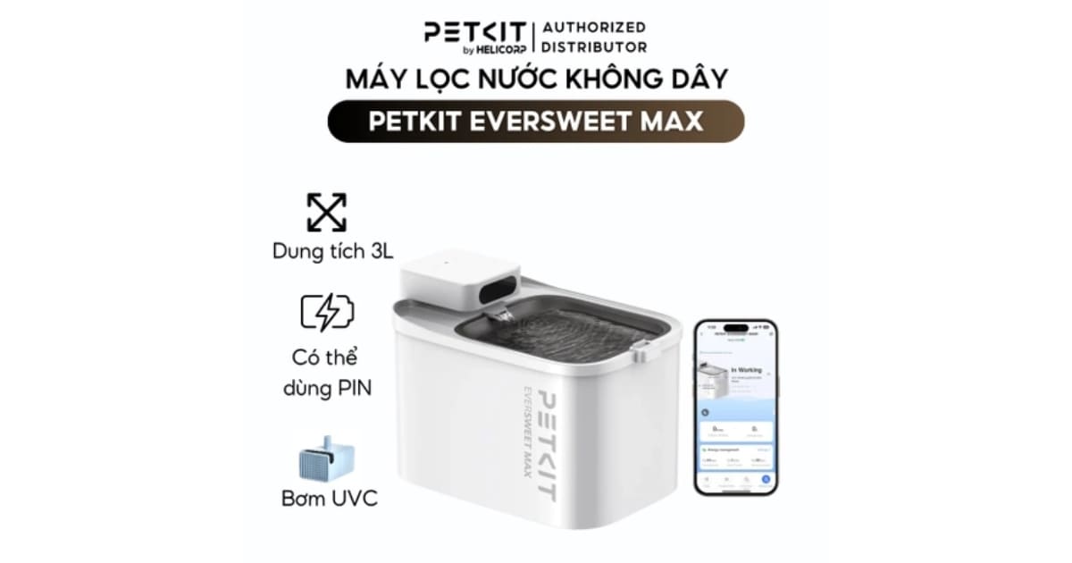 Dành cho những sen muốn chọn máy lọc nước “cao cấp” hơn chút. PETKIT Eversweet Max có dung tích lớn 3 lít, lý tưởng cho gia đình có nhiều mèo hoặc khi bạn thường xuyên vắng nhà. Hơn nữa, máy có tích hợp pin sạc có thể hoạt động đến 83 ngày, bạn có thể sử dụng không dây hoặc cắm điện đều được, linh hoạt đặt ở bất kỳ vị trí nào trong nhà mà không lo vướng dây. Hơn nữa, bạn có thể điều chỉnh chế độ, theo dõi thói quen uống nước của “hoàng thượng” thông qua app trên điện thoại.